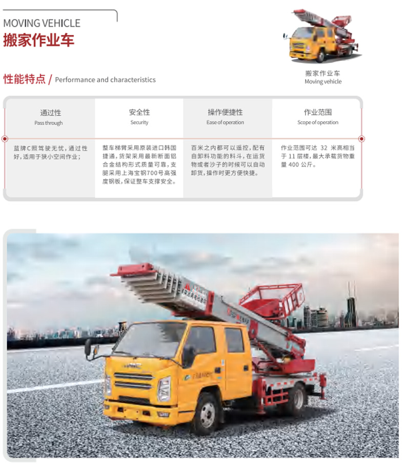 高空作業車價格_高空作業車廠家_楚勝集團★13908669111★江鈴30米搬家作業車產品名稱:楚勝牌CSC5041TBA6J30型搬家作業車,采用江鈴JX1041TSG26底盤改裝而成,該車專用裝置為云梯梯臂,主要用于搬家作業。作業范圍可達32米高相當于11層樓,最大承載貨物重量400公斤。本公司專業生產銷售各類伸縮臂高空作業車,折疊臂高空作業車,液壓升降車,搬家云梯車,外形美觀,操作方便,節省燃油。更多高空作業車盡在:www.siski.cn